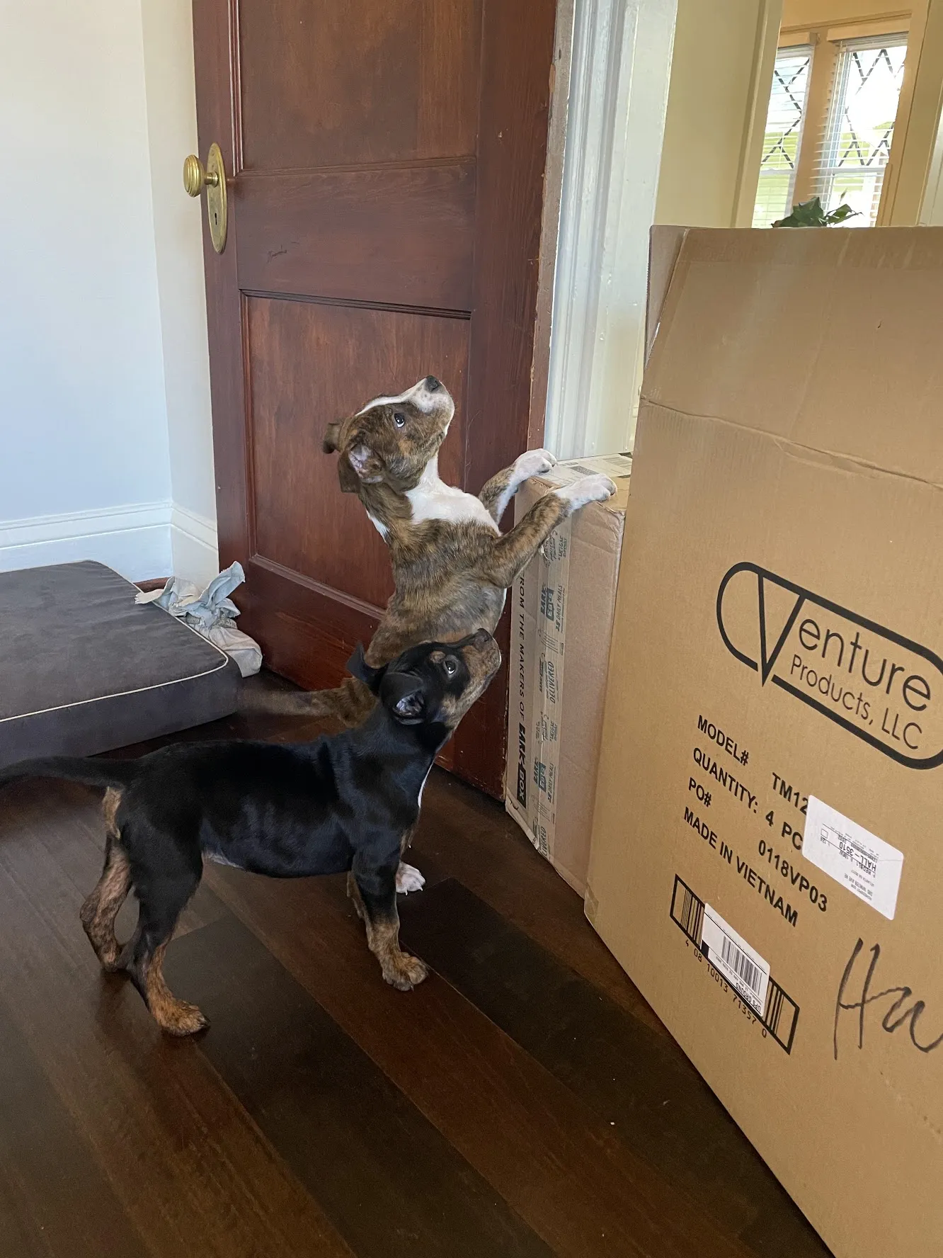 Munchie had Parvo and needed to quarantine until he tested negative. That meant we had daily poop disasters for a couple weeks. When he tested negative they got to play with our dog, Remi. It was a chaotic couple of weeks in our house, but it was a ton of fun.