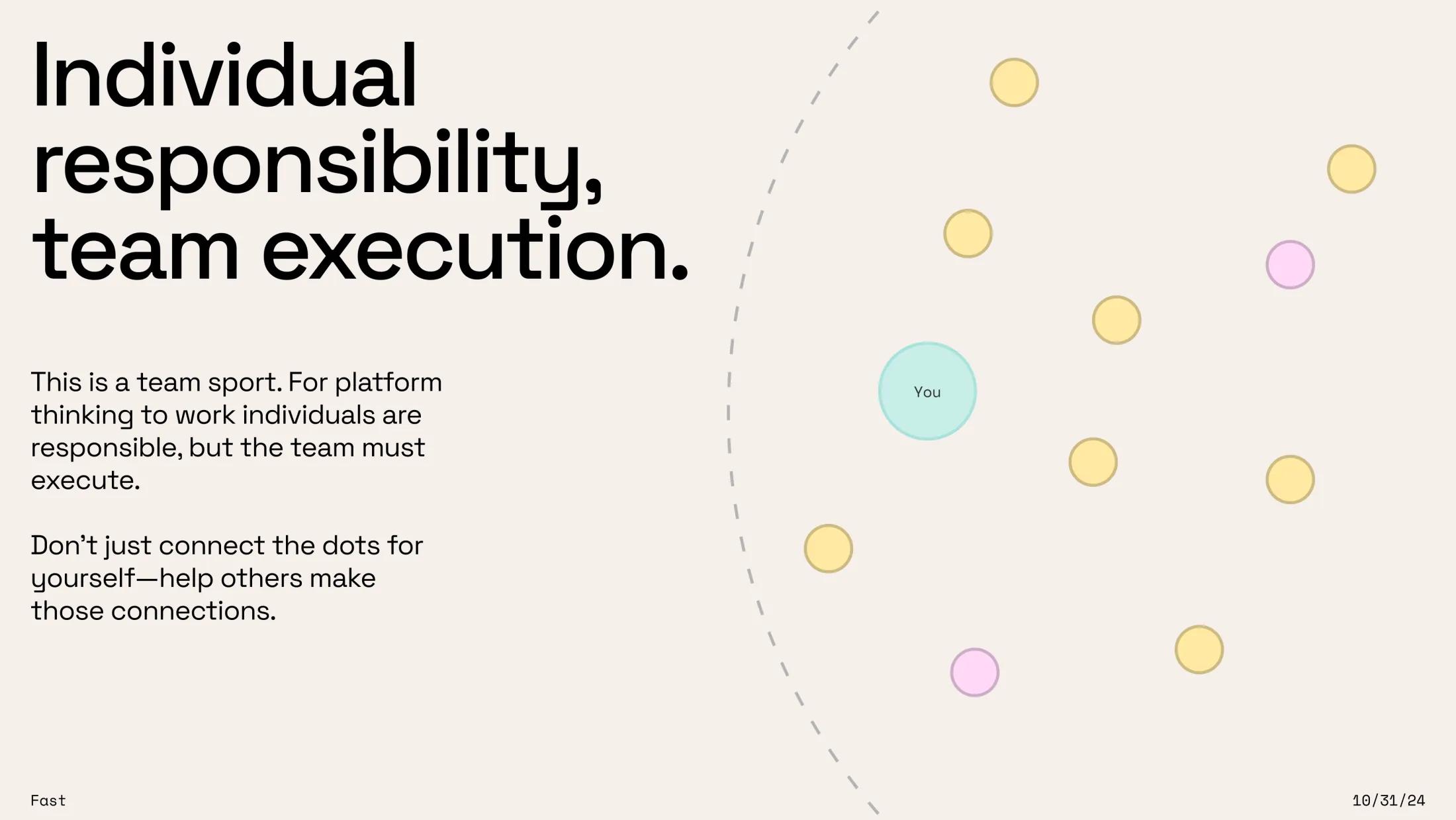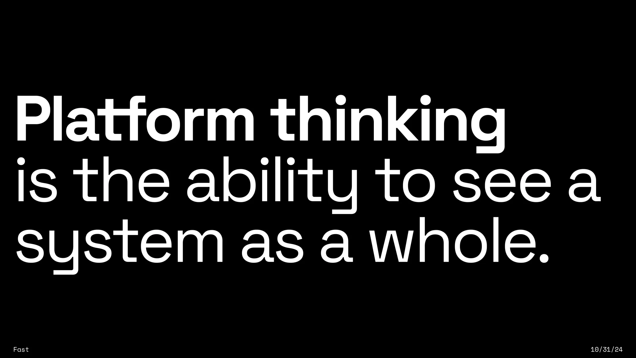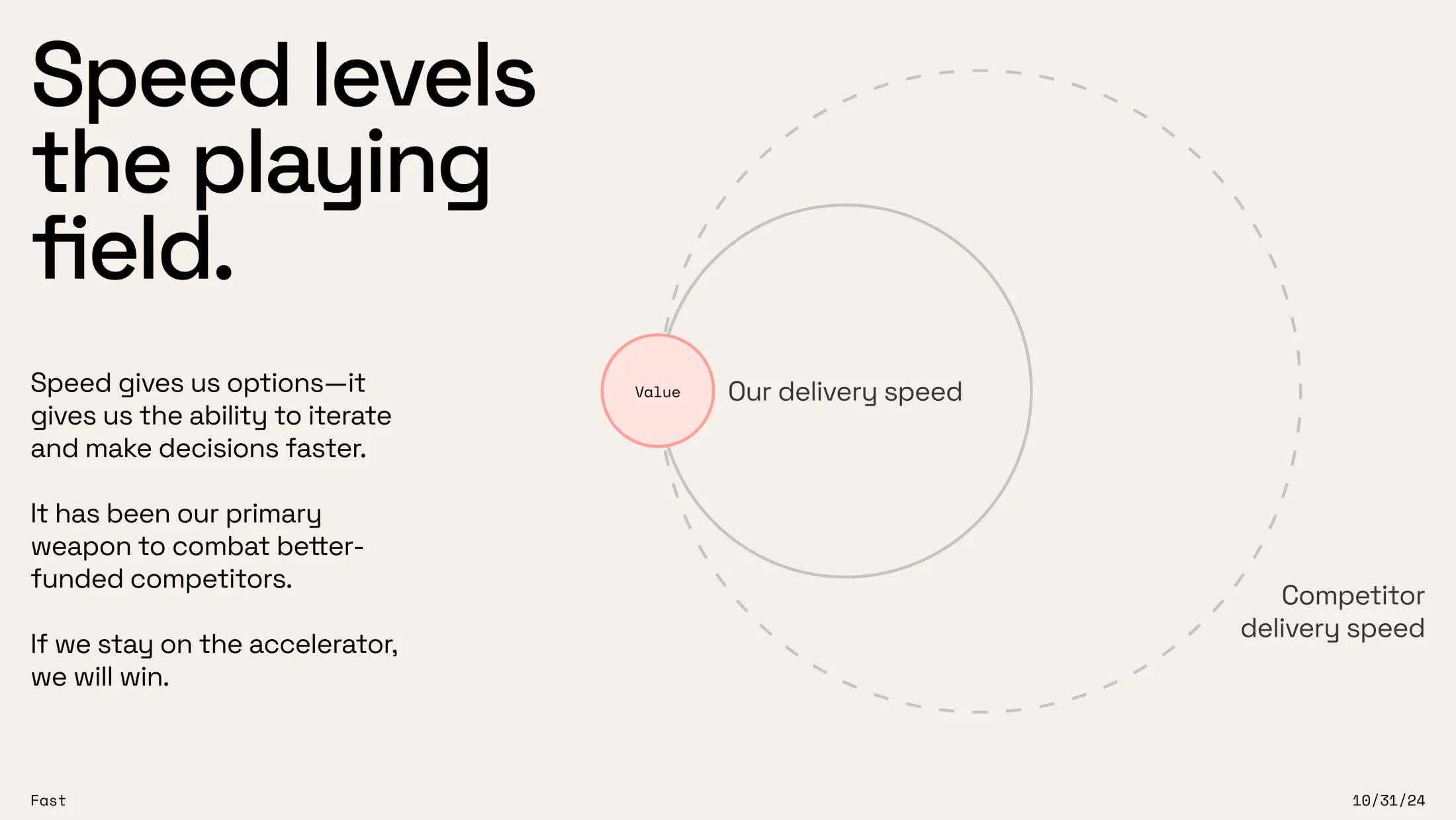 The presentation was well-received, and I was asked to give it again to close out product all-hands at the end of the month. Given the feedback and the larger audience, I reframed the presentation. This time, the focus was on going FAST. Platform thinking was just a strategy to achieve that speed.