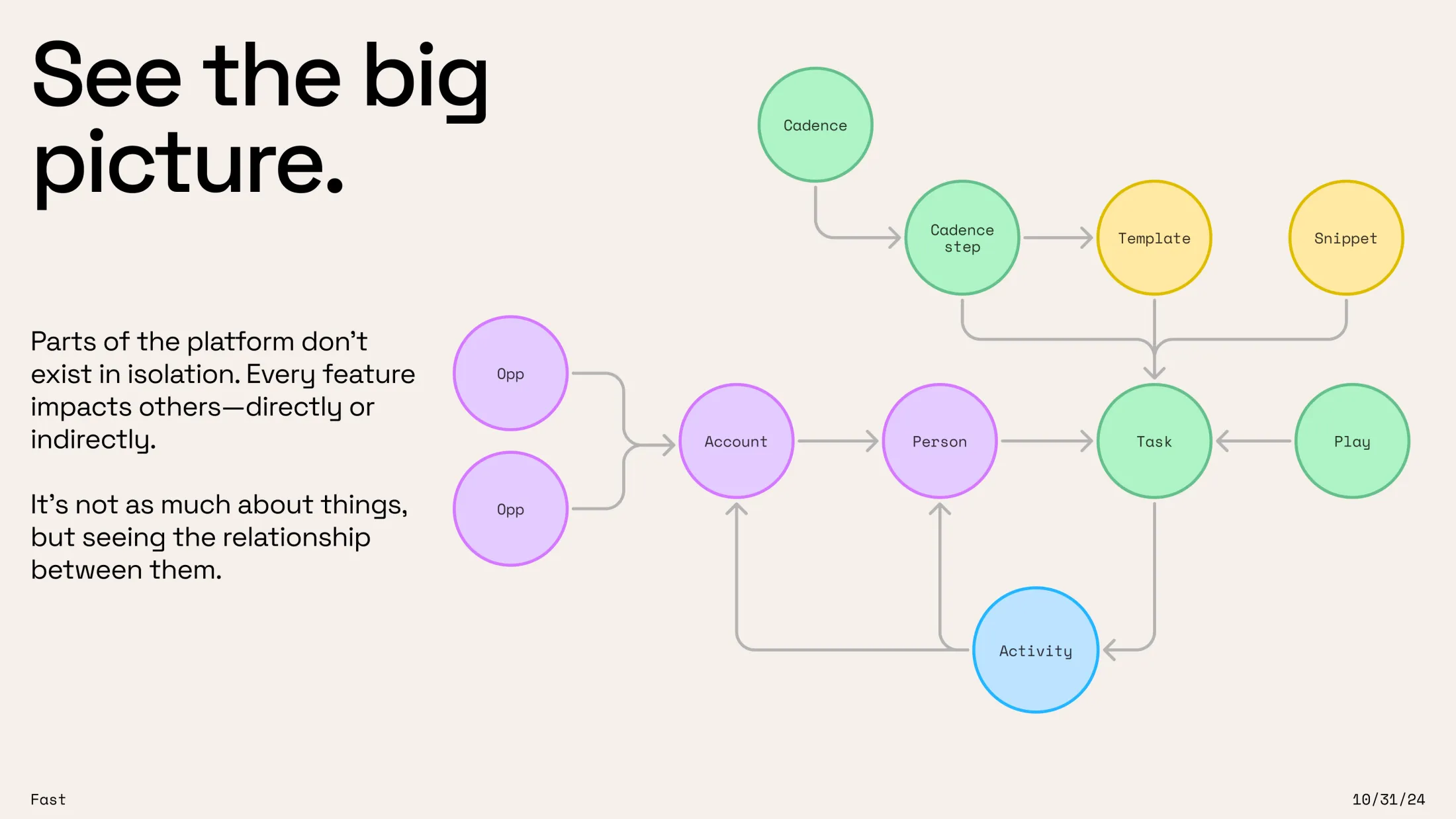 Designers, PMs, engineers—really anyone on this call would benefit from focusing on the relationship between things instead of the things themselves. Those little connections, instead of the entities.