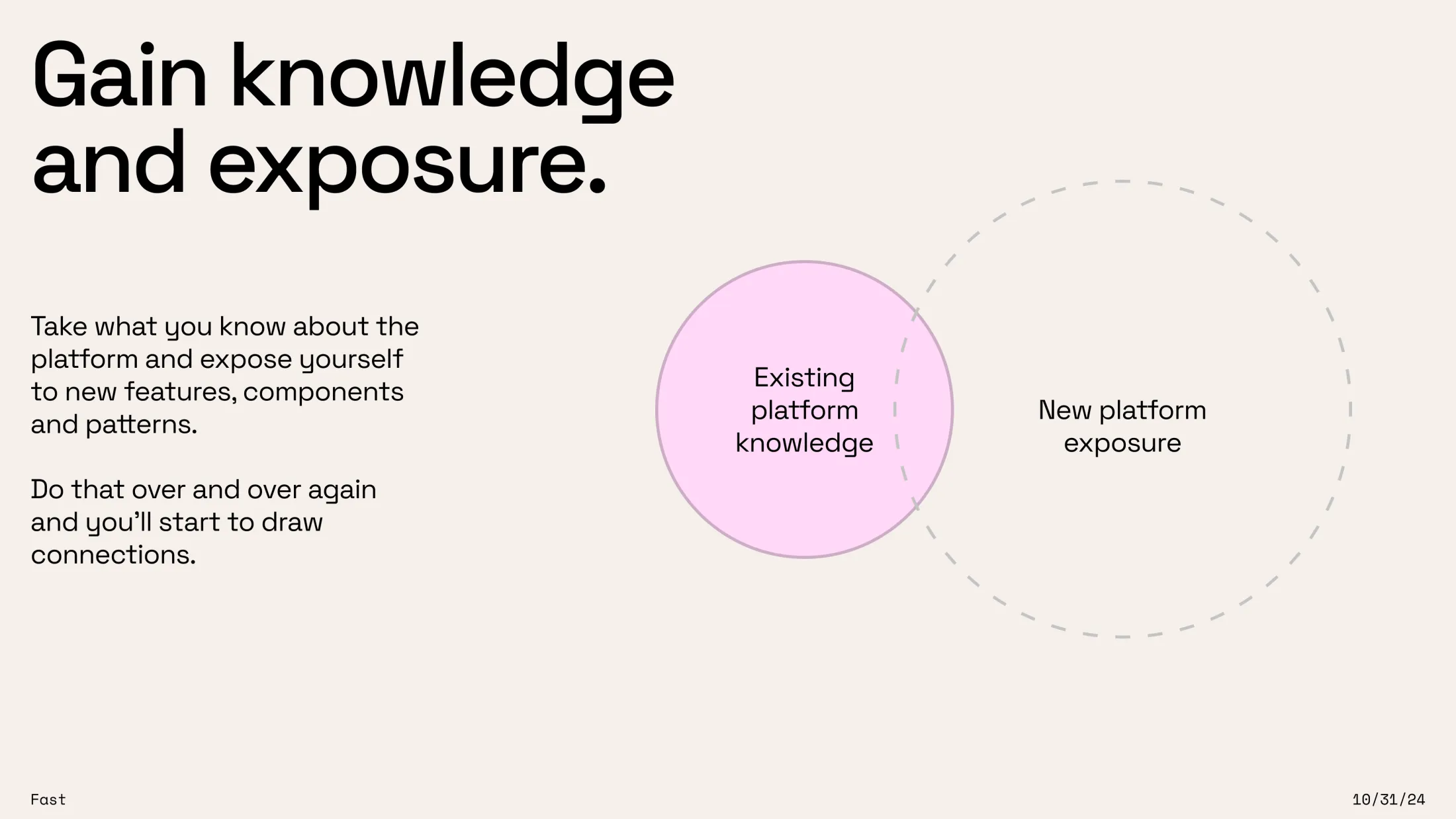 Take what you know about the platform and expose yourself to other features, components and patterns. Talk with others about the same. Do that over and over again and you’ll start to make those connections.
