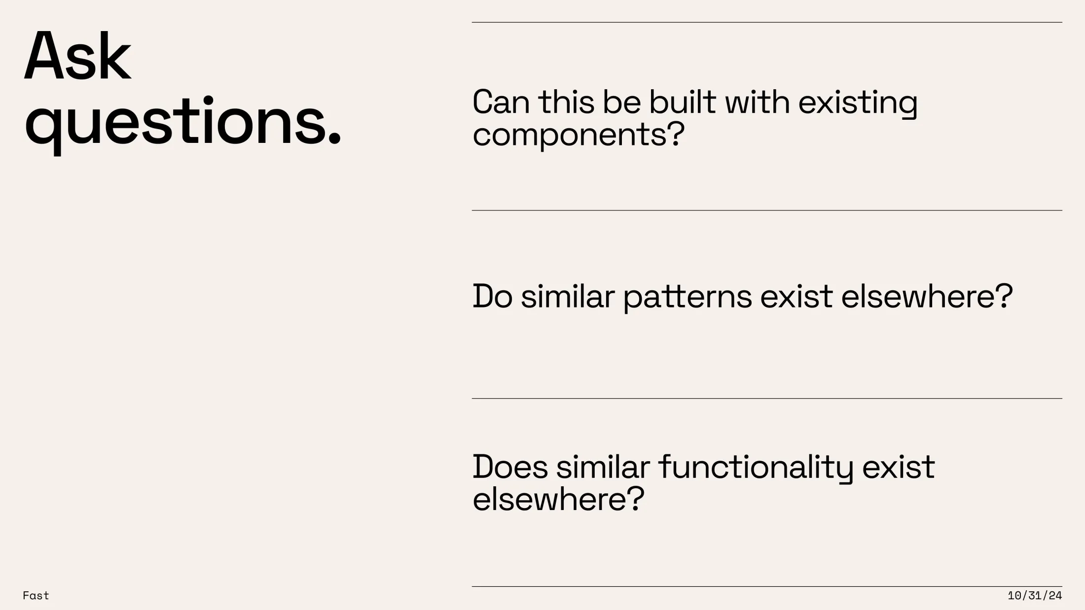 But I want everyone here to be asking themselves these questions when building software. We can save a ton of time by implementing features and components and patterns that we already have.