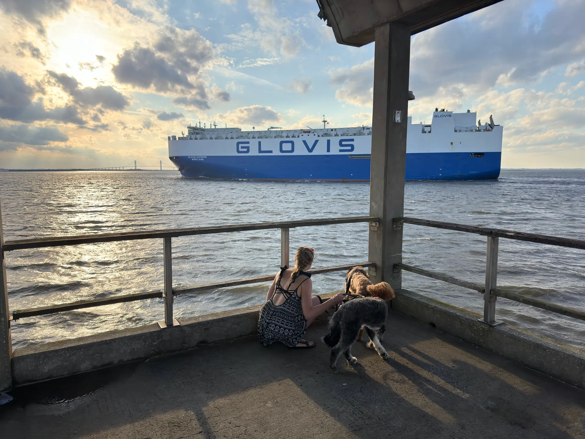 These ships look funny because they are car carriers. These ships take vehicles from Brunswick, Georgia all over the world. This one is run by Hyundai Glovis, who’s parent company produces Hyundai cars. It’s a similar type of ship to the one that capsized off of St. Simons in 2019.