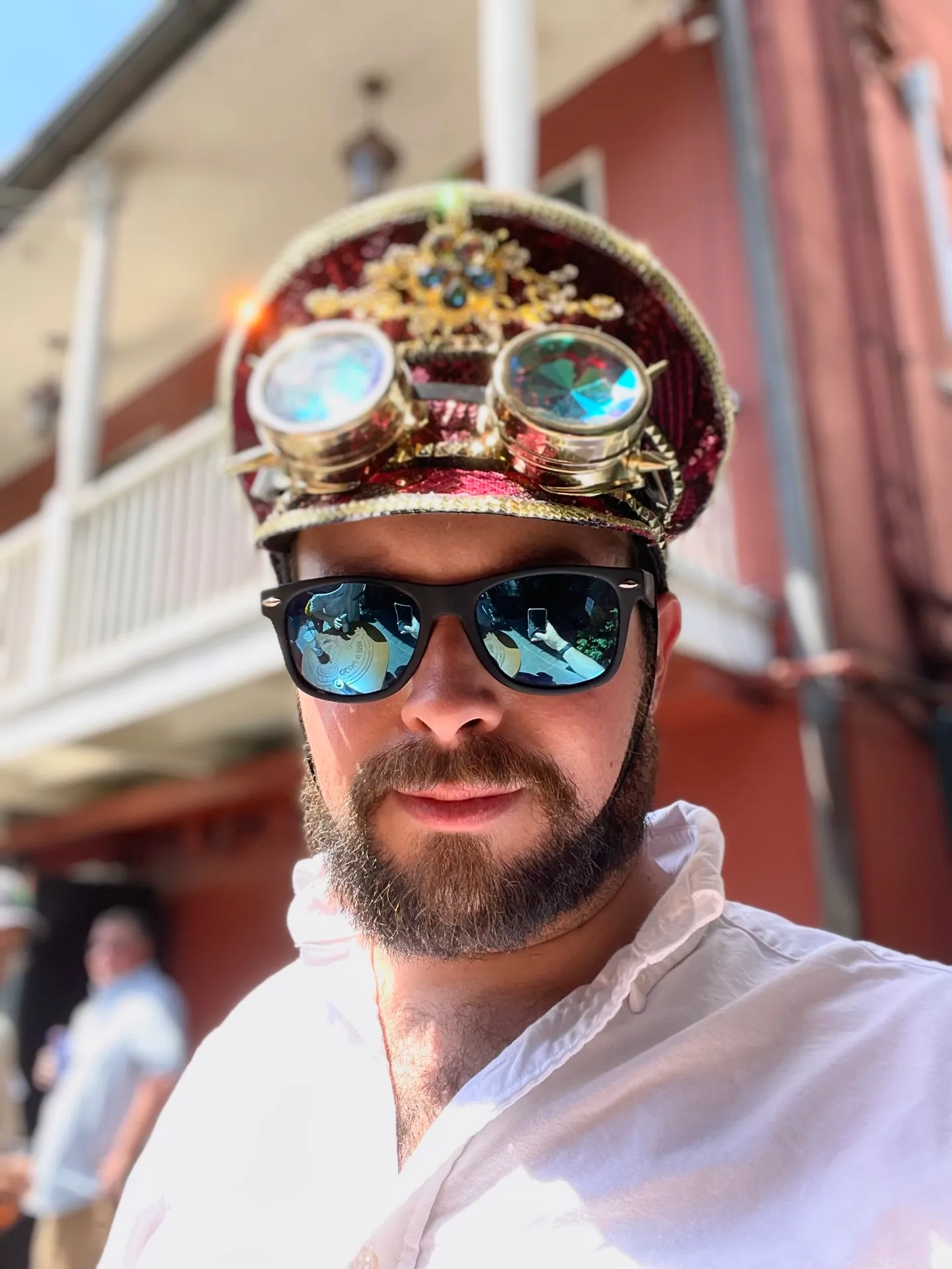 Also, it wouldn’t be a trip to New Orleans without something completely ridiculous. So here’s a shot of me with a bejewled steampunk conductor hat.