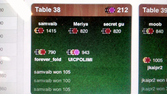 After two rounds at the top of our tables, we made the mistake of trying to improve something that clearly wasn’t broken. We decided to tell SamVaib to double his bet if he had a full-house or better. Things went downhill quickly. The only hands we were winning were hands where everyone else folded.